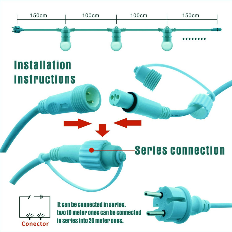Permite conectar as grinaldas em série para obter cadeias de luz mais longas.