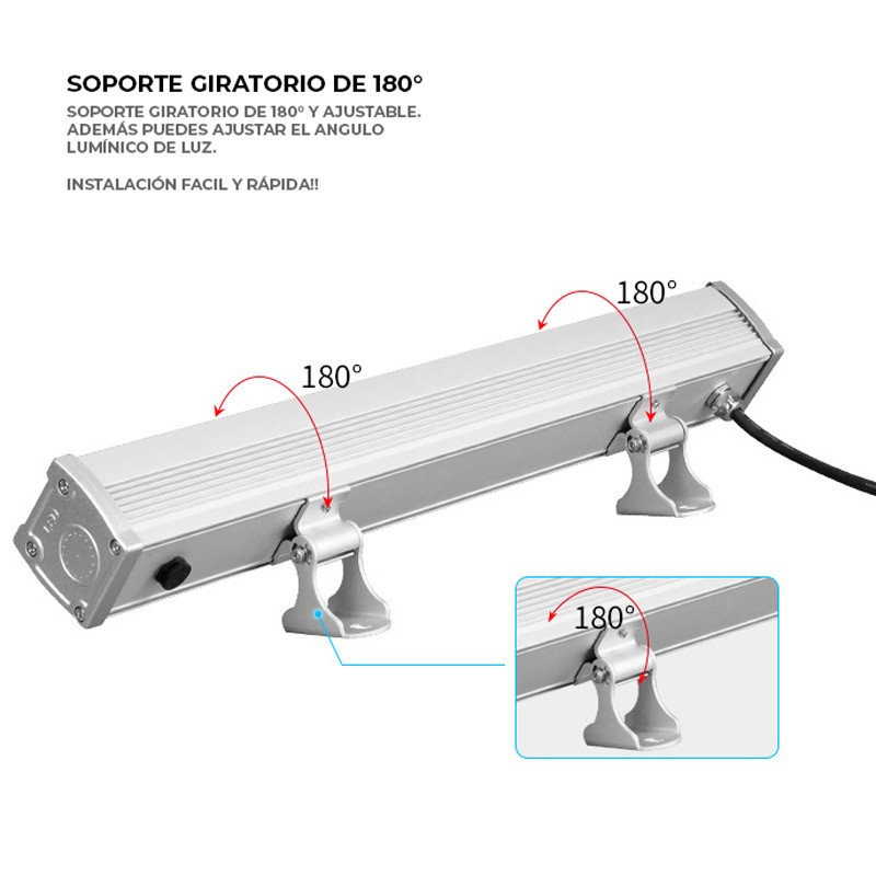 O projetor de parede LED RGB+CCT de 24W permite a iluminação, através de ligação remota ou controlo WIFI com WL-BOX1 (não incluído) a partir de um dispositivo móvel. Com mais de 16 milhões de cores RGB. Além disso, podemos controlar a temperatura CCT (do branco quente, 2700K, ao branco frio, 6500K) bem como a intensidade da luz, brilho, saturação, etc. Pode escolher a cor que mais lhe agrada para criar o efeito " Wall washwer", conseguindo uma iluminação LED espetacular em paredes ou fachadas. Uma forma inteligente e original de iluminação com os tons e intensidade que preferir. A barra LED tem uma elevada intensidade luminosa de 1600 lúmenes e uma eficiência luminosa de 60lm/W. O índice de restituição de cor é superior a 80 (CRI>80), com um factor de potência de >0,9. Com uma duração de vida de mais de 50.000 horas. O suporte articula-se a um ângulo de 180 graus.