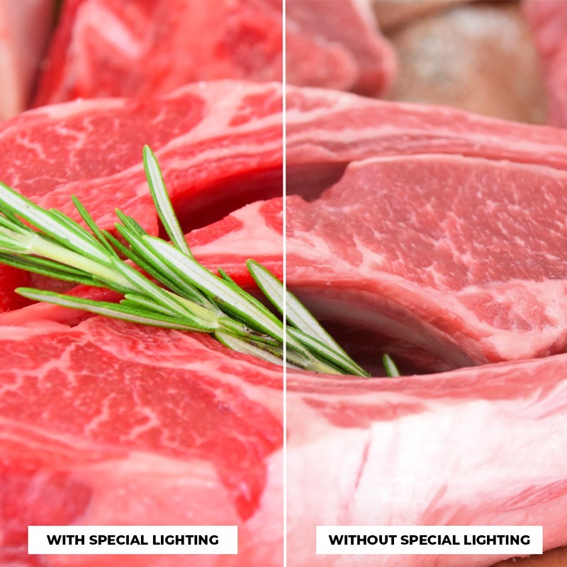 ✔ Emite uma iluminação em uma tonalidade rosada que realça a cor da carne, dando-lhe um aspecto fresco e apetitoso. Desta forma, melhora a percepção do produto por parte do cliente, favorecendo a decisão de compra.