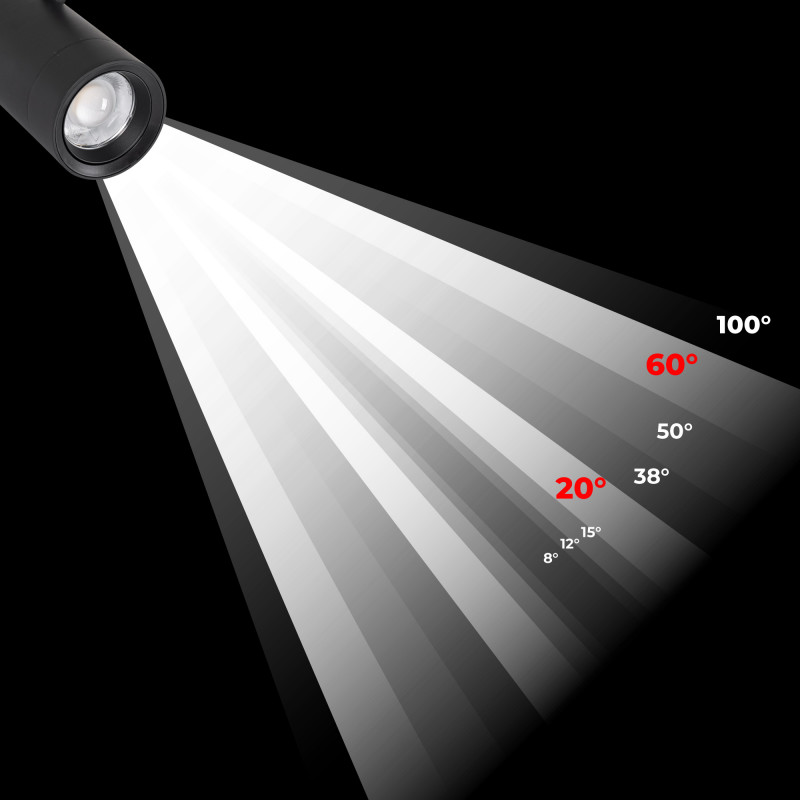 - Zoom incorporado: Ajuste facilmente o ângulo de luz entre 20º e 60º para destacar áreas específicas ou cobrir mais espaço.