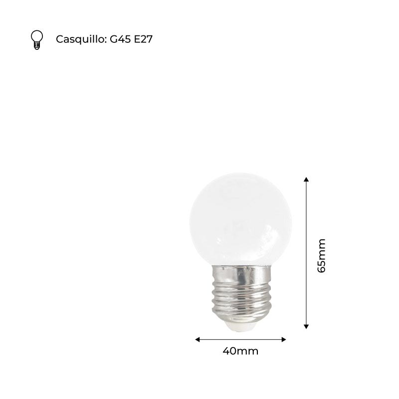 Lâmpadas LED esféricas disponíveis em diferentes cores. Este tipo de lâmpadas são amplamente utilizadas para decorar casas, terraços, lojas, bares, bares de praia e restaurantes, dando-lhes um toque de cor muito atrativo para atrair pessoas ao seu comércio. Decorar e iluminar com estas lâmpadas com a grinalda exterior . É ideal para dar um toque de cor e decoração a uma sala, conseguindo uma poupança de energia de 80%.