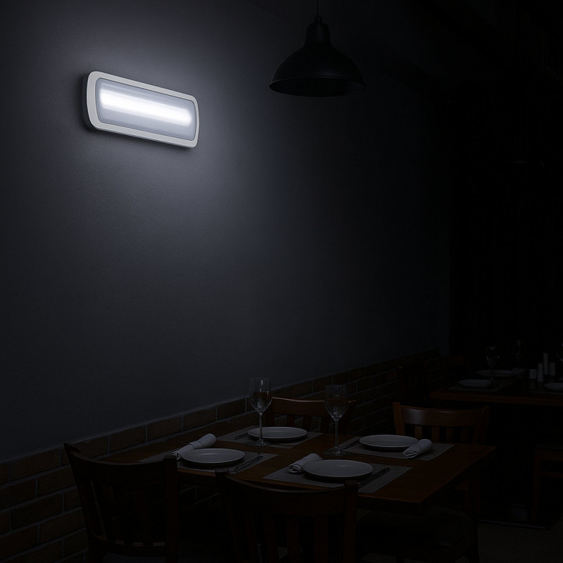 Esta luz de emergência LED fornece iluminação de reserva durante as falhas de energia, proporcionando visibilidade em situações de emergência.