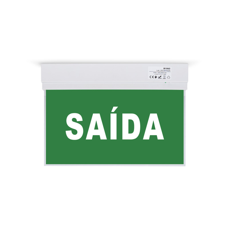 Luz de emergência permanente suspensa com placa autocolante "Saída"
