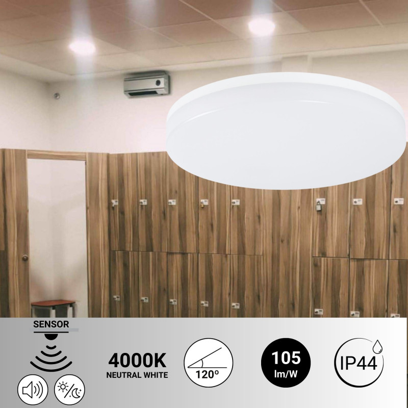 Luminaria de teto LED 18W - Sensor de som + sensor crepuscular - IP44 - Ø26 cm