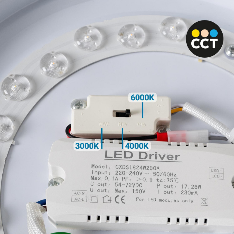 - Tonalidade ajustável: Sistema CCT para ajuste da temperatura da cor entre: branco quente (3000K), branco neutro (4000K) e branco frio (6000K).