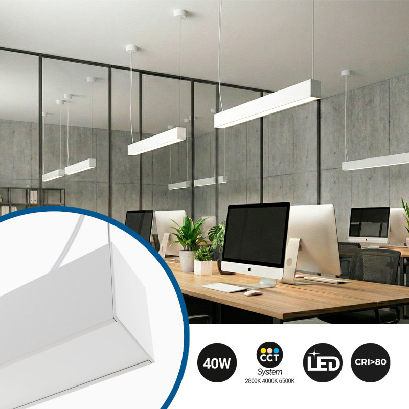 Luminária pendente linear LED com um design moderno, ideal para escritórios, lojas e espaços de trabalho que necessitem de uma iluminação profissional, eficiente e com elevado conforto visual.