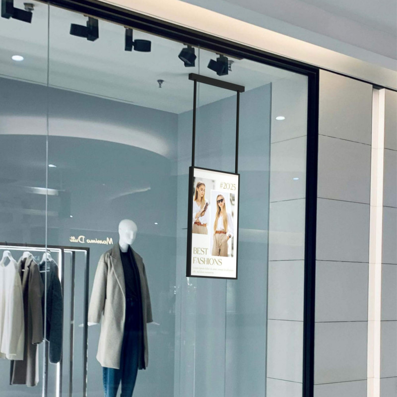 Este display está diseñado especialmente para escaparates de tiendas con instalación en techo, de esta forma se permite aprovechar al máximo el espacio sin obstrucciones ni estructuras en el suelo. Permite mostrar videos promocionales, imágenes, ofertas especiales o anuncios de nuevos productos atrayendo miradas desde lejos. Ideal para tiendas que buscan un impacto visual limpio, moderno y altamente eficaz.