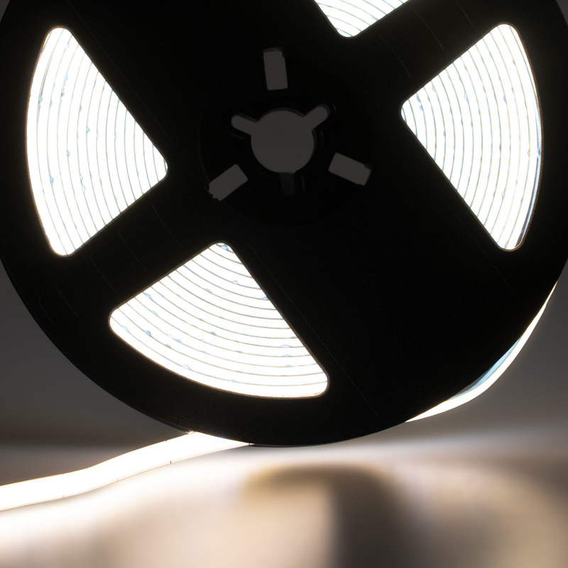 Esta tira LED incorpora tecnología COB, que le permite emitir una luz continua, sin puntos visibles, especialmente recomendable cuando se desea una iluminación homogénea, trabajar con superficies reflectantes o utilizar difusores transparentes.